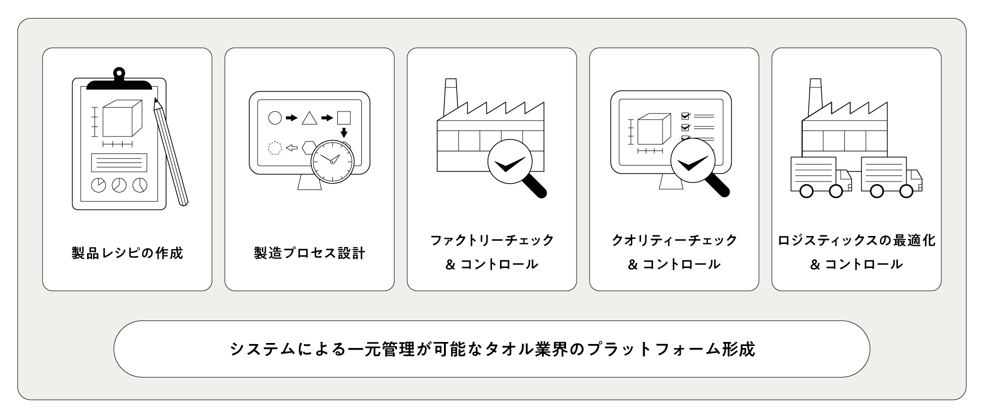製品の設計図作成から製品がお客様のもとへと渡るまで、独自のシステム化による管理体制を構築し、従来のタオル製造を超えるクオリティを実現しました。また、製造コストの圧倒的なイノベーションを可能にし、類を見ないパフォーマンスを提供できるようになりました。