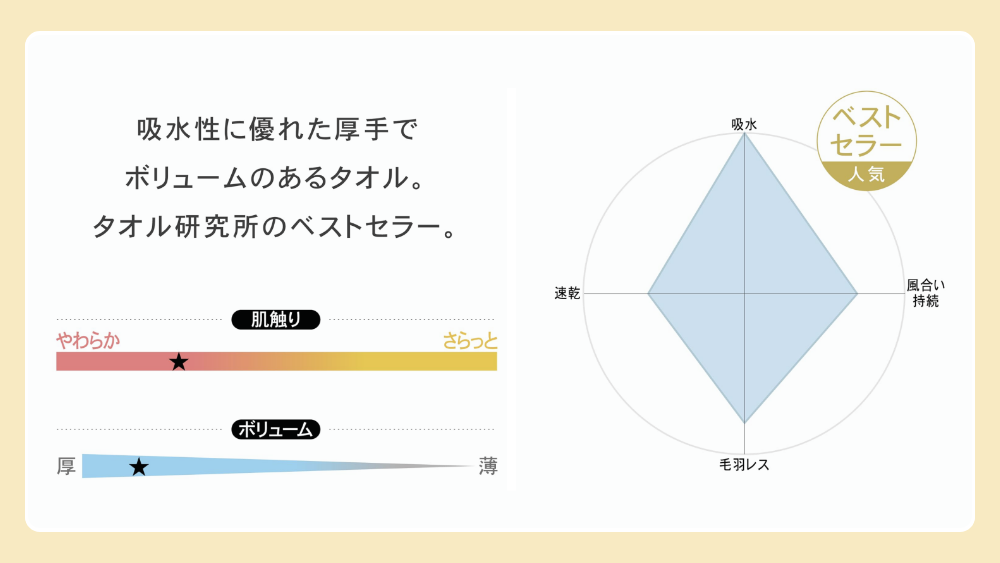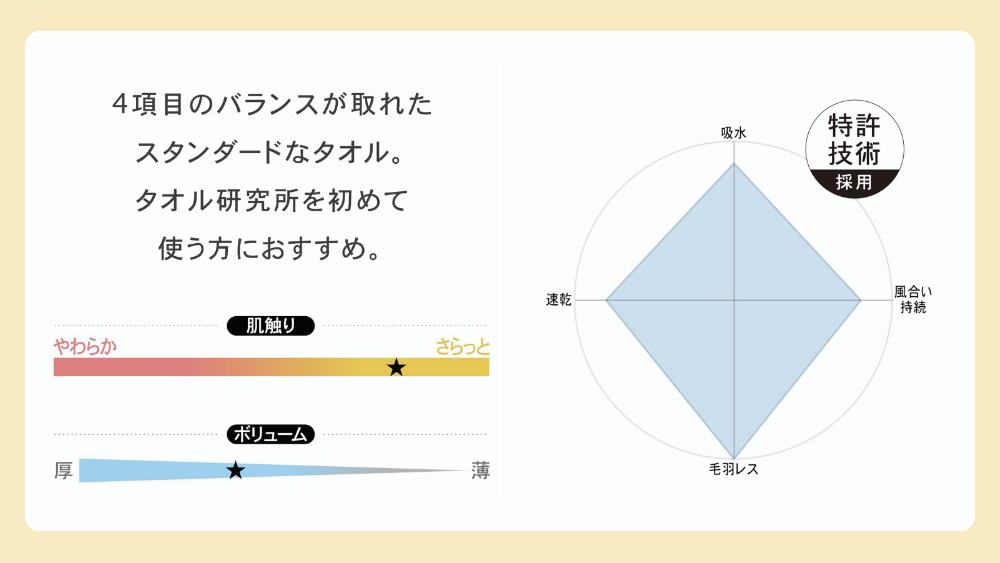 タオル研究所のそれぞれのシリーズは、単なる主観で設計するのではなく、吸水性・速乾性・耐久性・毛羽落ちの少なさ・肌触りなどの機能性の客観的な評価をもとに、お客様のお悩み解決に繋げられるよう、一つひとつ丁寧に設計しています。