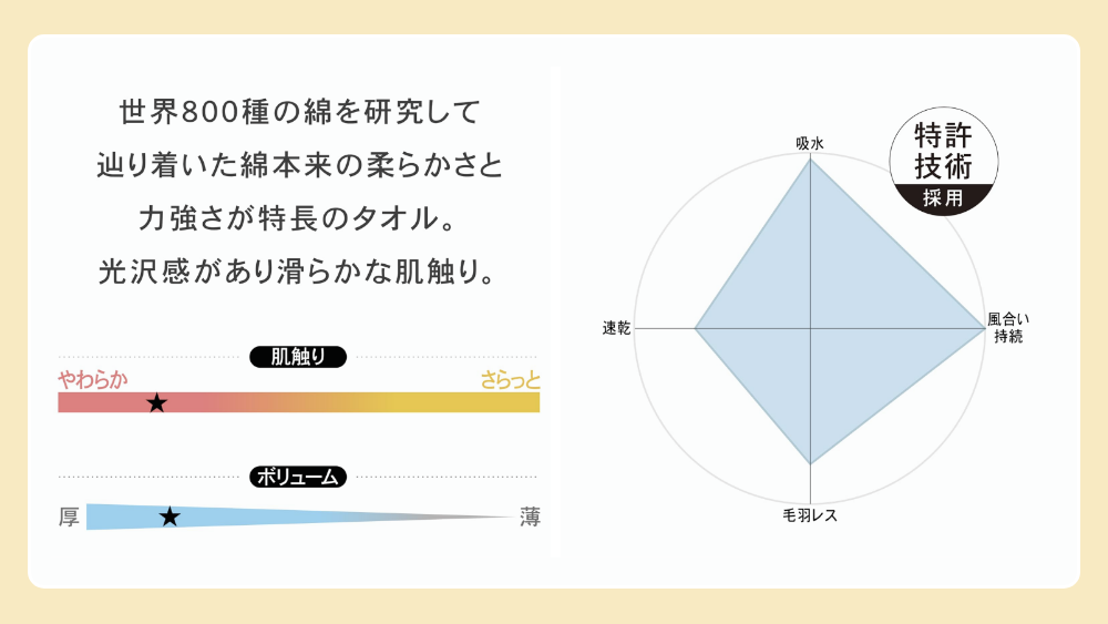 お客様に最も喜ばれているのは、その圧倒的な吸水力です。お風呂上がりにゴシゴシと肌を擦る必要がなく、タオルを体に優しく押し当てるだけでスッと水分を吸い尽くす心地よさを味わっていただけます。