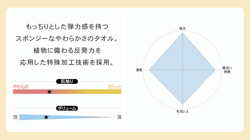 第5位![]() | #033 スポンジータッチ | もちもち・やわらかで、しっかりとした中厚手 | 「普通のタオルの拭き心地では物足りない」「もっと癒やされたい」 |