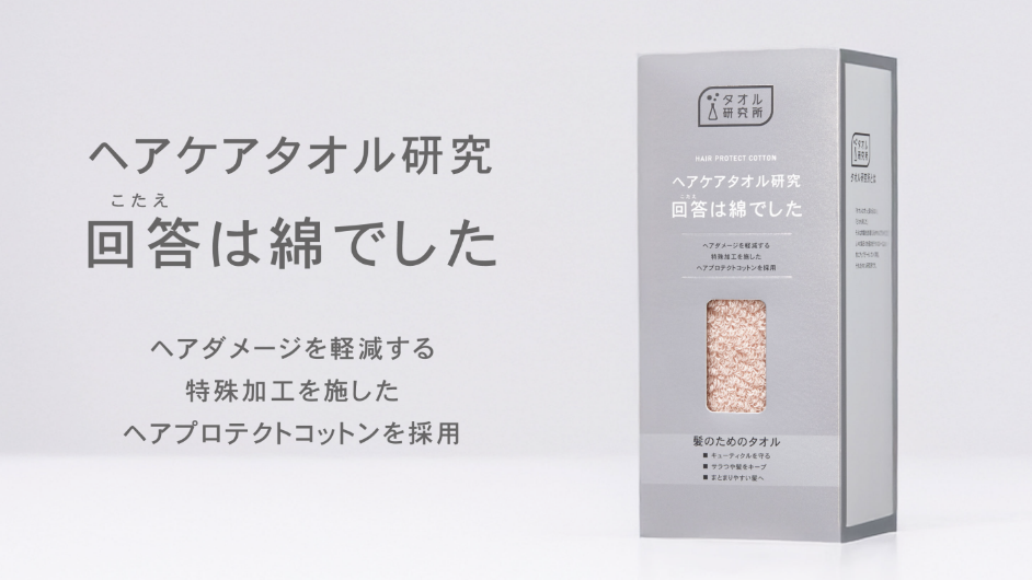 「お風呂上がりのタオルドライで髪がパサつく、傷んでしまう……」そんなお悩みに、タオル研究所が美容の観点から本気で向き合って開発したのが、この「ヘアケアタオル研究 回答は綿でした」です。