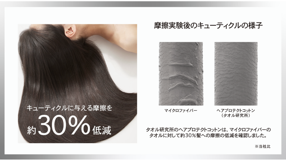 市場のヘアドライタオルはマイクロファイバー製が多いですが、私たちが摩擦を数値化して研究を重ねた結果、たどり着いた答えは「摩擦を抑える特殊加工を施した綿素材(ヘアプロテクトコットン)」でした。