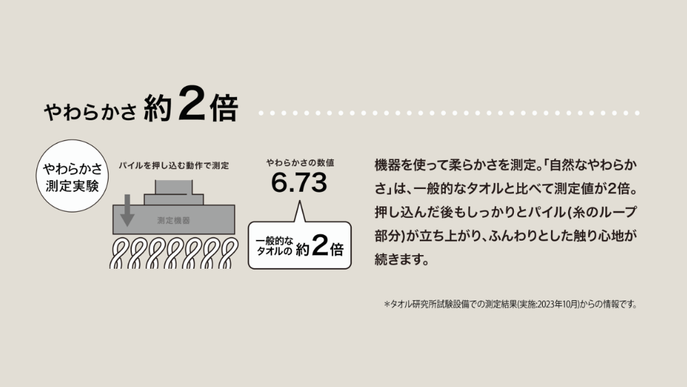 ランキング第4位にも入った「#024 自然なやわらかさ」。開発期間2年というとおおげさに聞こえるかもしれませんが、タオル研究所はその間「やわらかさの数値化」へ取り組んでいました。実はこの研究内容は「2024年繊維学会年次大会」でも発表をしています。