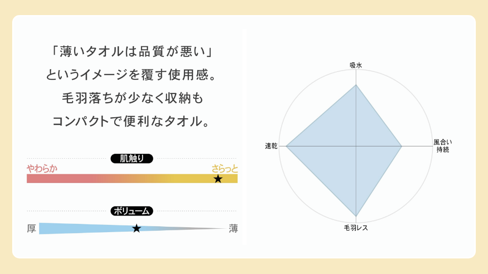 圧倒的な乾きの早さが毎日の家事をスムーズにし、薄手でかさばらないので洗面所の収納棚もすっきり解決します。
